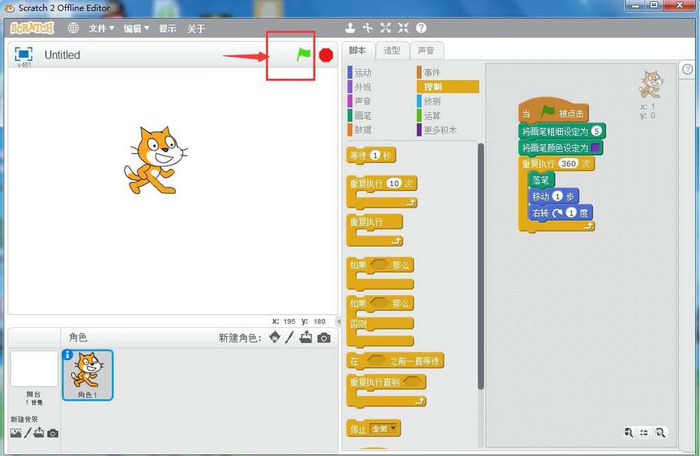 6、點擊綠旗執行程序;
