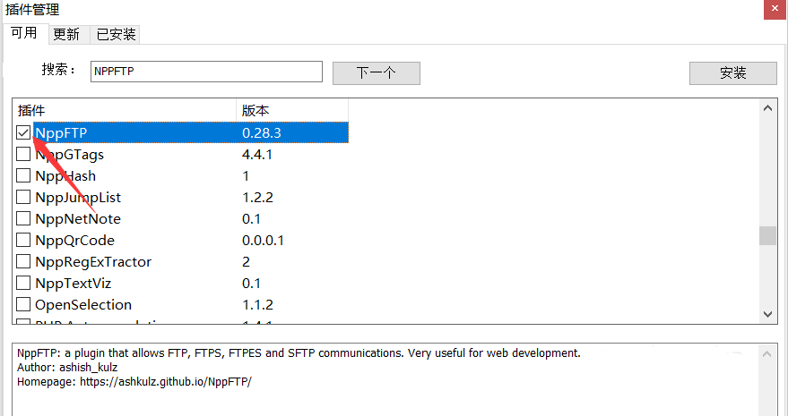 3、在這里輸入搜索“NppFTP”,找到之后點左上角的“安裝”