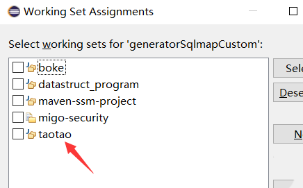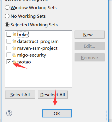 4、這時(shí)候項(xiàng)目已經(jīng)導(dǎo)入進(jìn)work set中,下面來查看:點(diǎn)左邊視圖的倒三角圖標(biāo),選中“select working set”,選擇剛才選中的那個(gè)“taotao”
