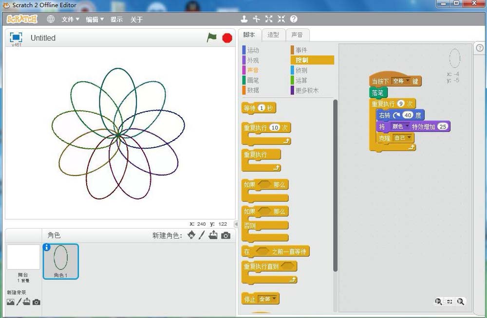 8、點擊空格鍵開始執行程序,橢圓就開始旋轉、克隆,重復執行9次,完成花的繪制。