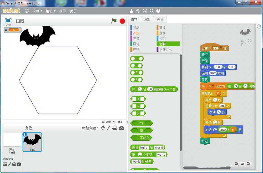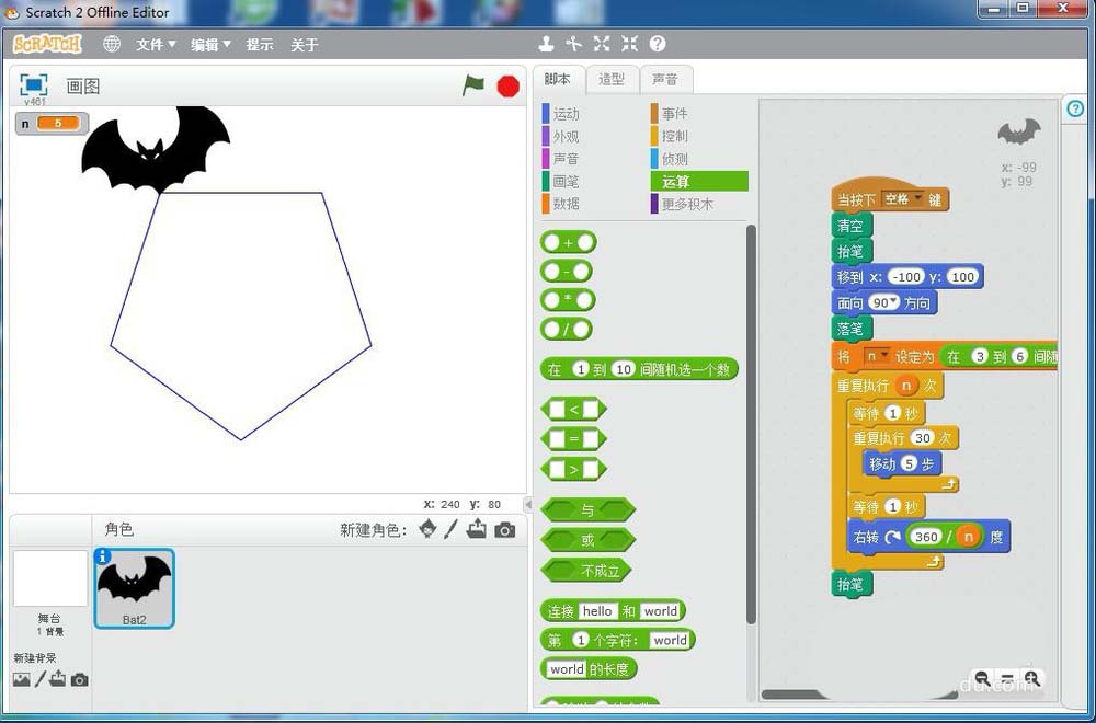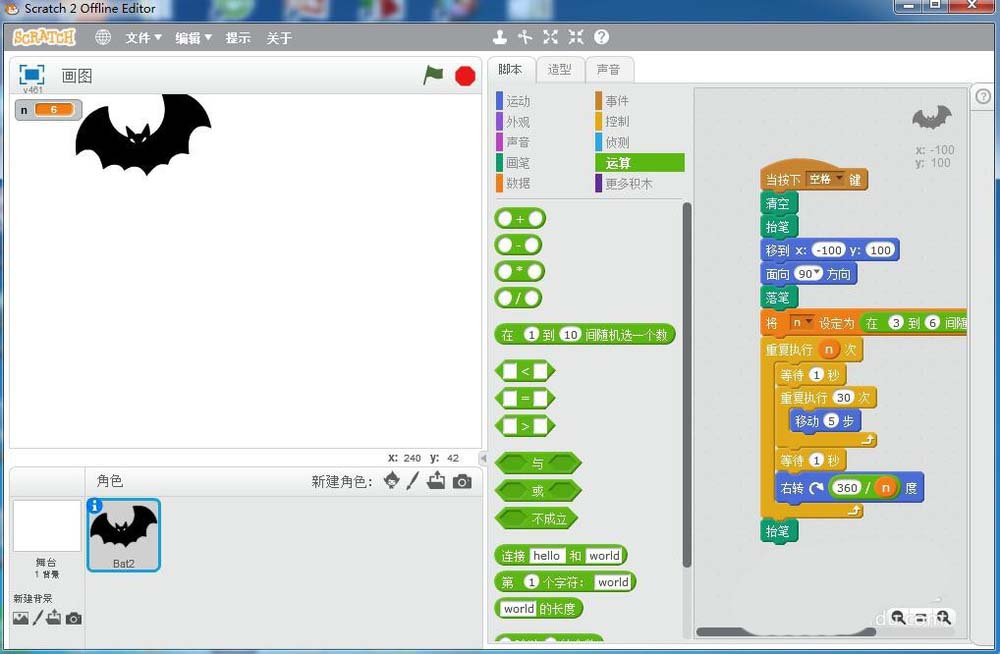 5、給蝙蝠添加如下腳本,讓它隨機(jī)畫(huà)邊長(zhǎng)為3到6的隨機(jī)多邊形;