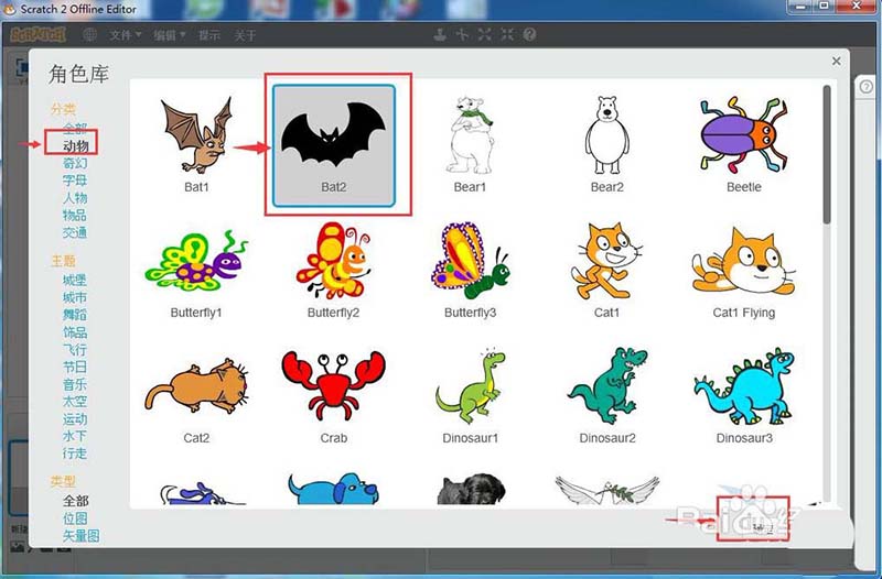4、在角色庫(kù)中點(diǎn)擊動(dòng)物類(lèi),找到蝙蝠,選中它后按確定;