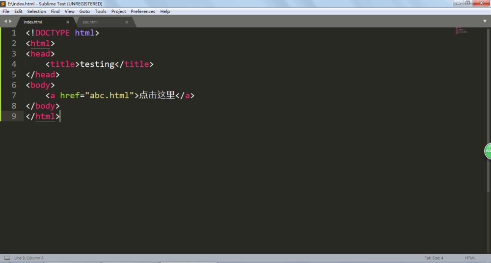 5、在主頁上寫:<a href="abc.html">點擊這里</a>。這個時候點擊就能夠跳轉了。