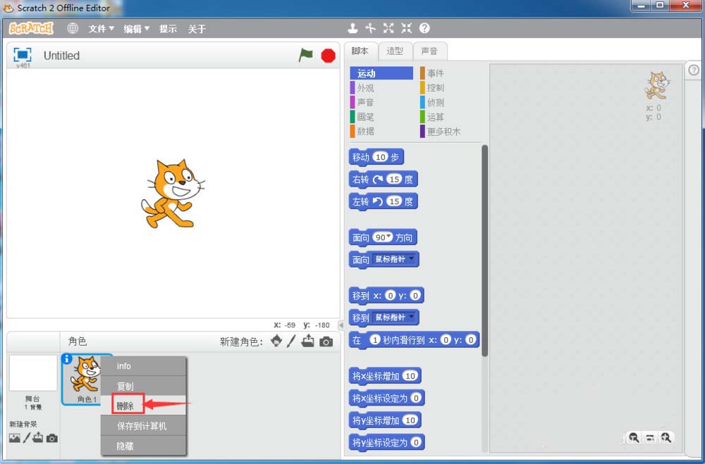2、在小貓上面按右鍵,在打開的快捷菜單中選擇刪除,將小貓刪除掉;