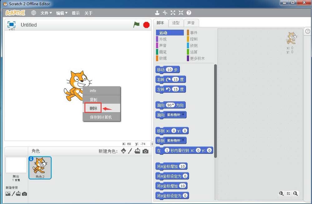 2、在角色貓上點擊右鍵,打開快捷菜單,選擇刪除命令將其刪除;