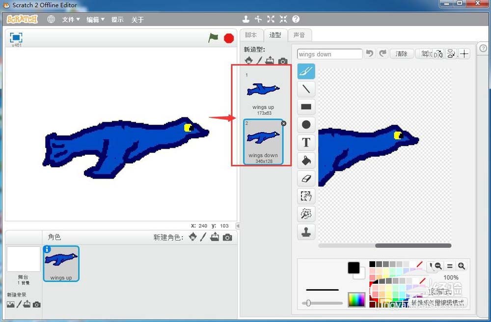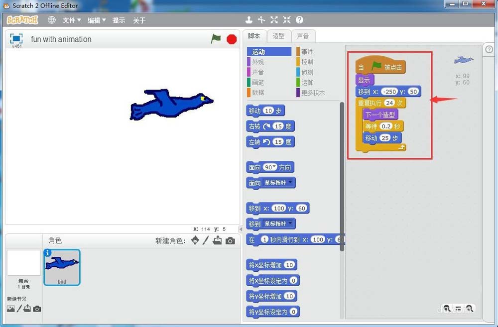 以上就是scratch創建小鳥飛行的動畫效果的教程,希望大家喜歡,請繼續關注武林網。