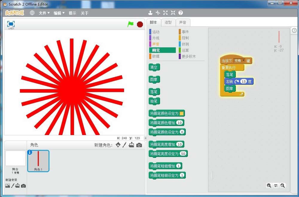scratch中繪制的基本圖形可以旋轉,克隆自己,完成一些特殊圖形的繪制,比如扇子圖形,該怎么繪制呢?下面我們就來看看詳細的教程。