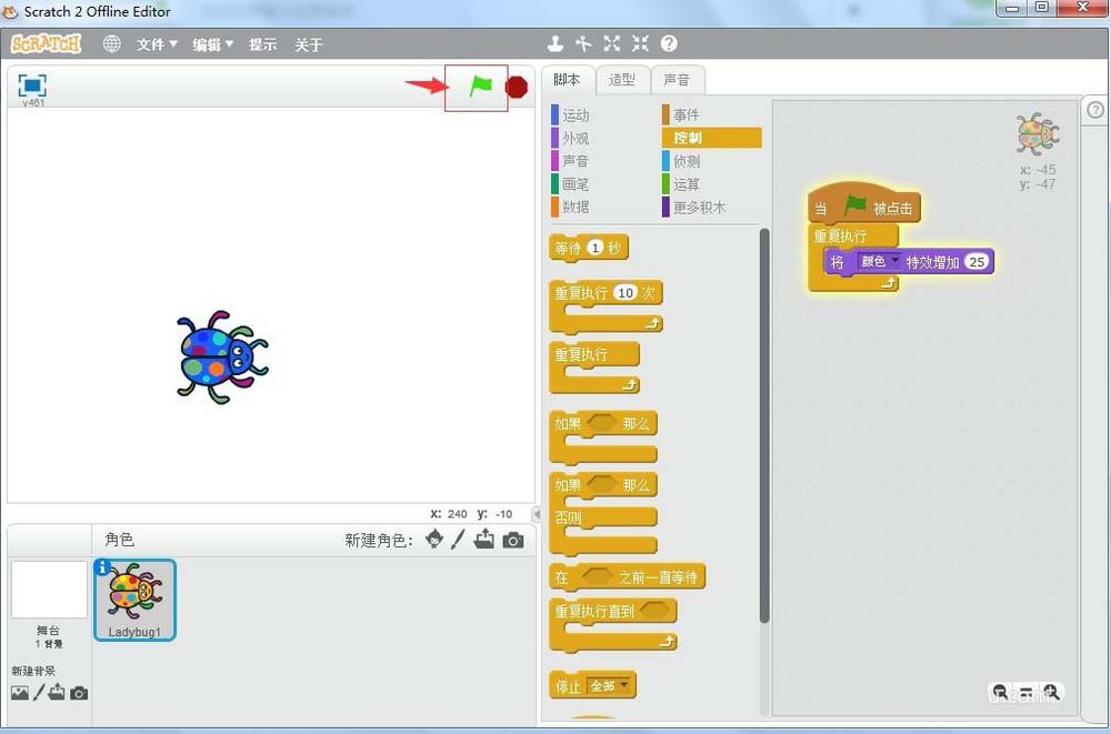 9、點擊綠旗執行程序,瓢蟲就開始變色了,用這樣的方法我們就可以在scratch中創建一個會變色的瓢蟲動畫。