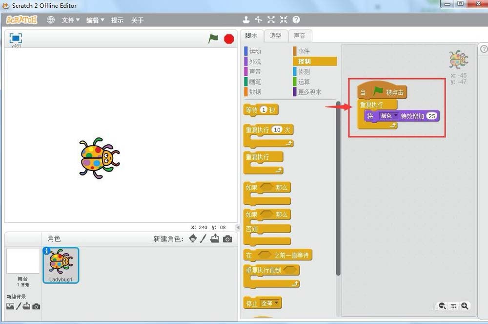 scratch編程軟件怎么實現會變色的瓢蟲動畫呢?很簡單,我們需要使用顏色特效,下面我們就來看看詳細的教程。