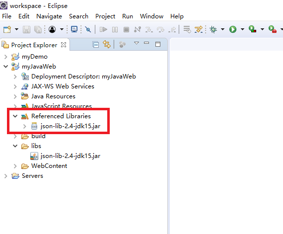 5、此時我們可以在referenced libraries中看到jar包,此時我們的json就導入完成了。