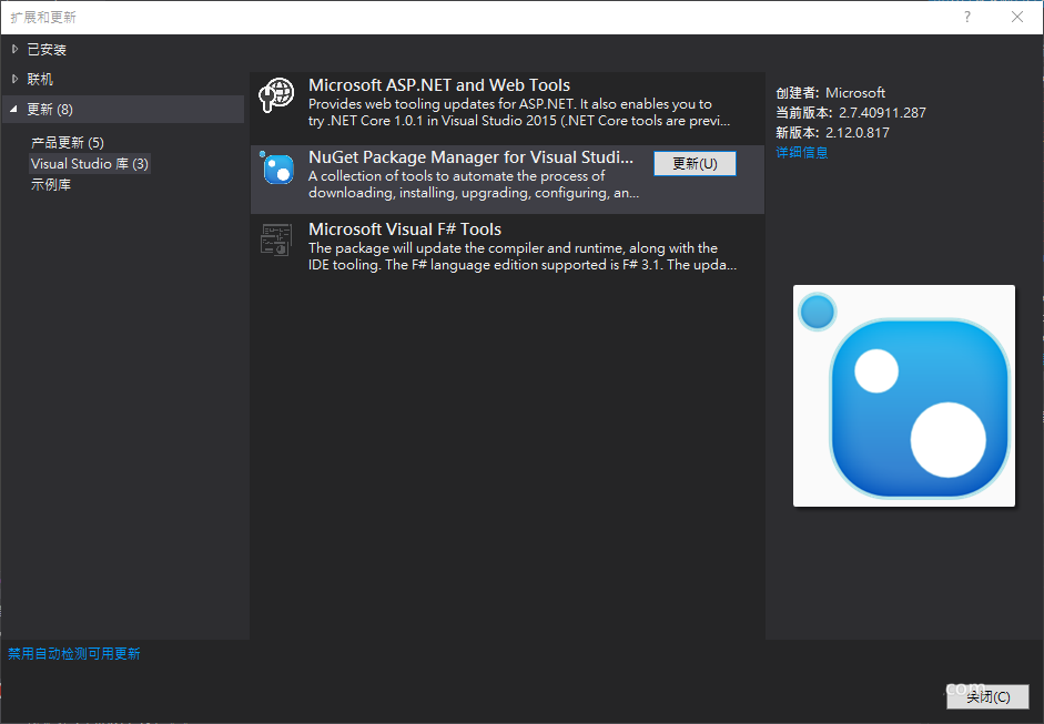 2、在左邊找到更新,選擇VS庫就會看見NuGet 包管理器更新。直接點擊更新后會開始下載。