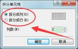 接下來的拆分單元格窗口中,可以選擇拆分成行和拆分成列,本人選擇拆分成列,列數為2。
