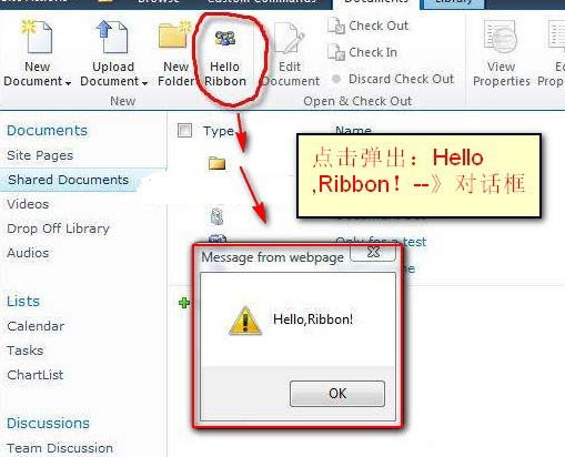 6、點擊彈出:Hello ,Ribbon!--》對話框。