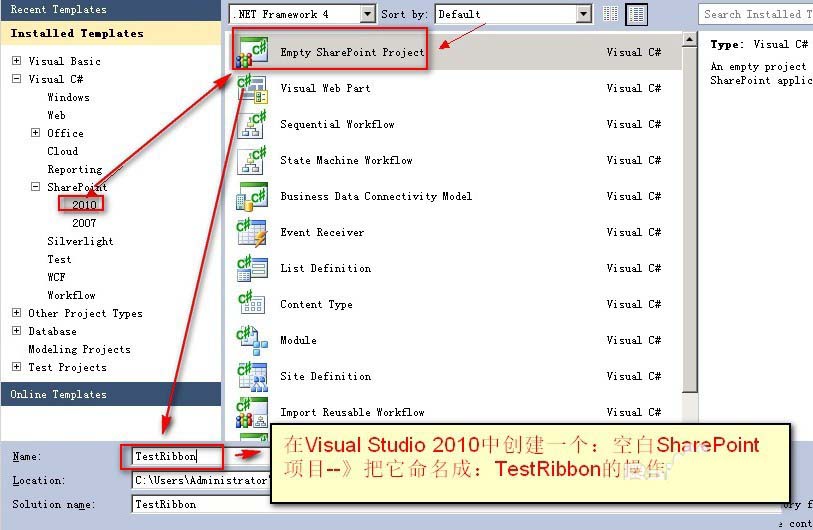 3、在Visual Studio 2010中創建一個:空白SharePoint項目--》把它命名成:TestRibbon的操作