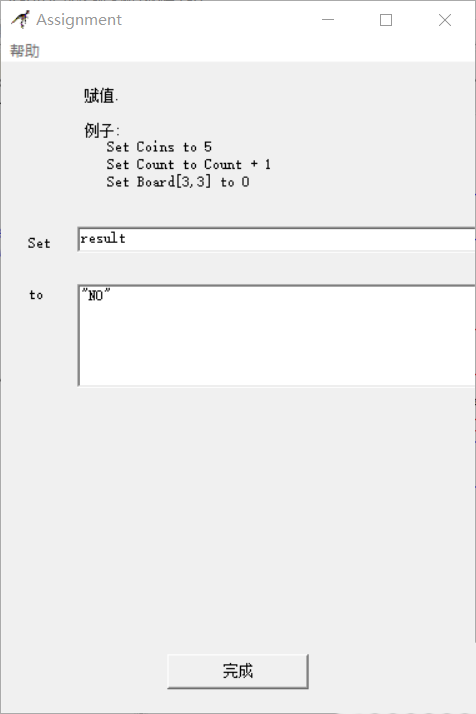 在賦值框1上方輸入 result 下方輸入 "YES"