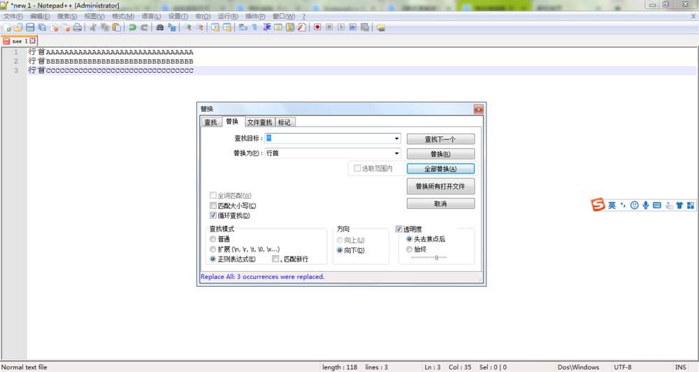 上面操作的意思是將文本開頭替換成想要增加的內容,實現了每行開頭都添加想要的內容。 如圖所示,每行開頭都添加了“行首”