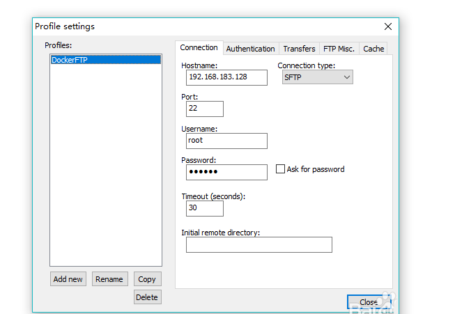 7、然后填寫你要連接的地址,端口,賬號,用戶名,密碼。按照你地址等一定要寫對啊,否則你可進不去,一下是我使用的。完成后點擊右下角的【close】