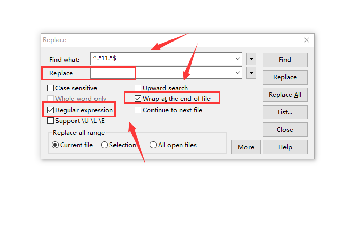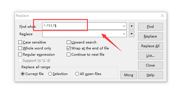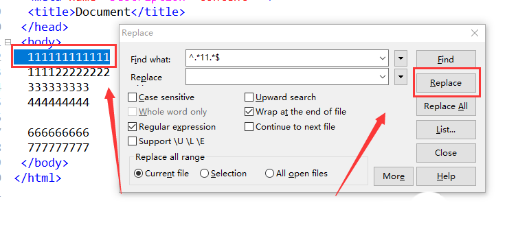 4、如果為刪除操作,則replace中不用填寫內容,同時勾選regular expression。
