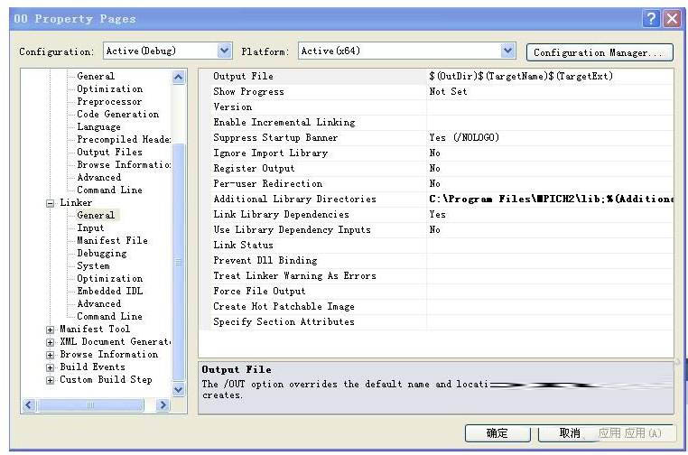 3>配置為所有配置的時候,“鏈接器”選項卡里面的“常規”選項卡,為“附加庫目錄”加入目錄“C:/Program Files/MPICH2/Lib”;