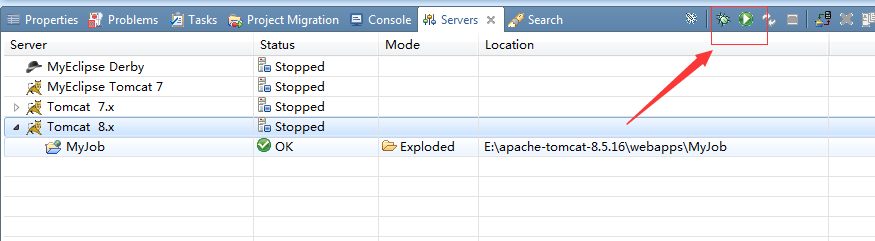5、在這個servers控制臺頁面,右上角有2個啟動項標識甲殼蟲和開始,如圖,點擊甲殼蟲啟動的是調試模式,一般開發者都啟動這個,這樣在調試的過程可以打斷點,如圖是開始這是普通啟動。只能網頁打開來看,不能調試