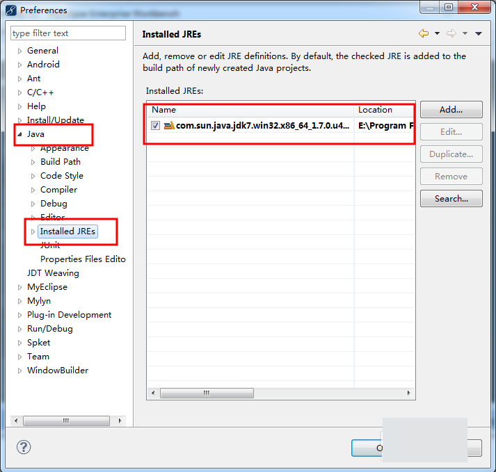 5、在左側找到java 下的InstalledJREs選項 可以看到右側的是MyEclipse的自帶的默認JDK