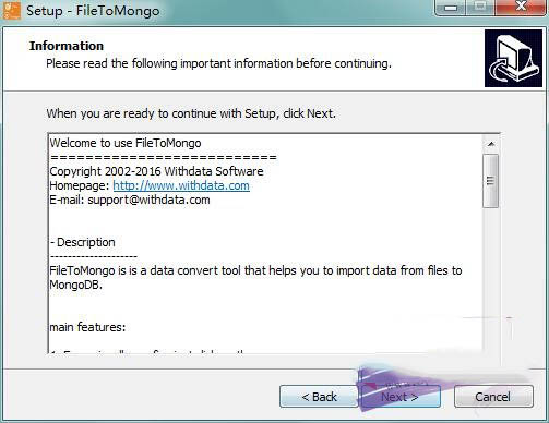 1、在本站下載FileToMongo,解壓,進入歡迎界面,點擊next