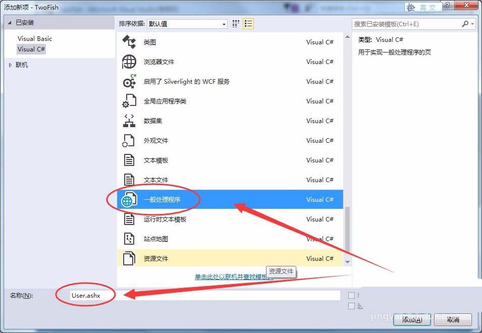 5、列表中選擇一般處理程序選項,將名稱改為User.ashx,單擊添加。