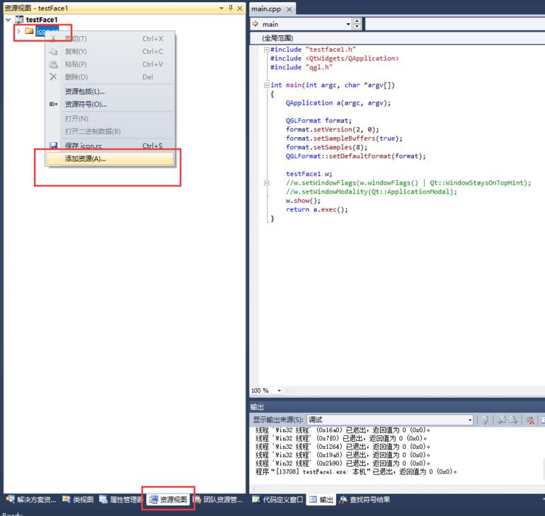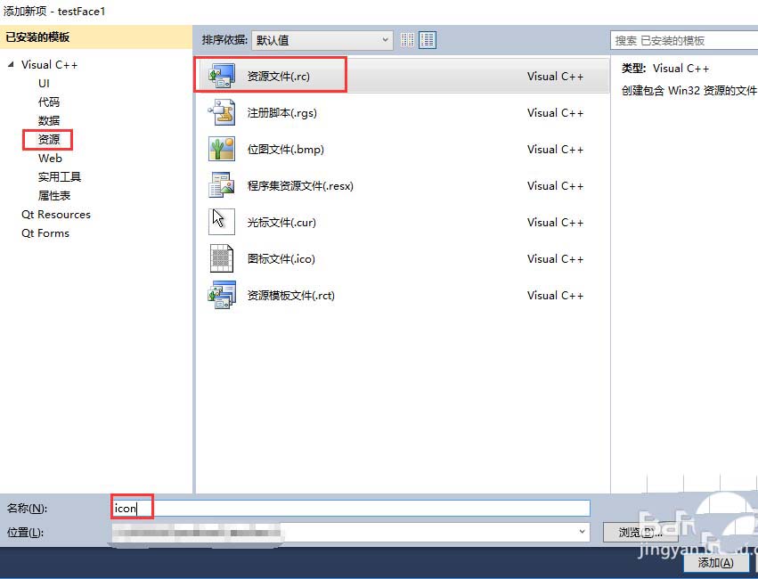 5、點擊【資源視圖】面板-->右擊剛剛新建的【icon.rc】-->【添加資源】。