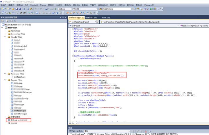 7、再回到工程界面,看到下方外部資源項中多了兩項,.ico文件和.rc文件,再在與工程名同名的cpp文件中添加以下兩行代碼。