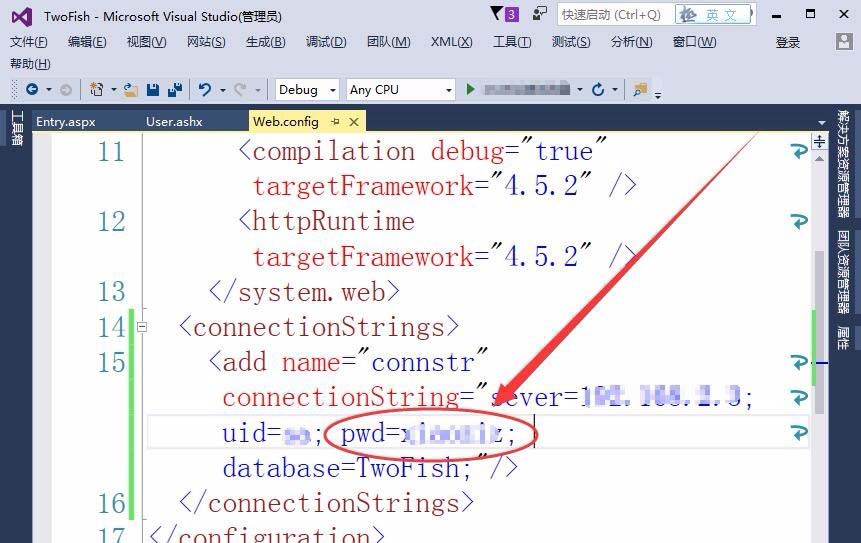 8、輸入代碼中的pwd,表示連接的SQL Server數據庫的密碼,輸入自己SQL Server軟件的密碼即可。
