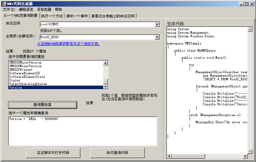 利用WMI代碼生成器可以執行查詢或者執行一個方法等,還可以查看當前或者遠程電腦上的命名空間以及其下的類,并且還可以生成相關的代碼(不然就不叫WMI代碼生成器了),支持生成的代碼類型包括VBS、C#及VB.NET,默認生成的代碼是VBS。