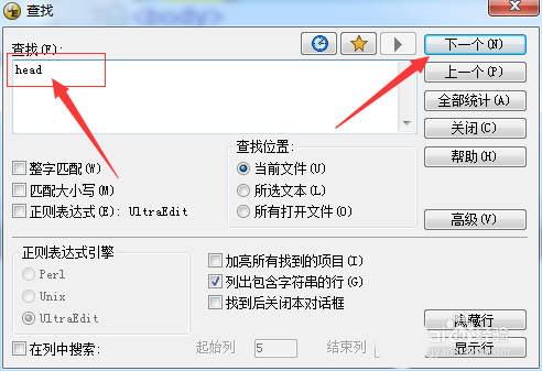 5、然后在查找的輸入框中輸入head的,進(jìn)行點擊 下一個 按鈕。