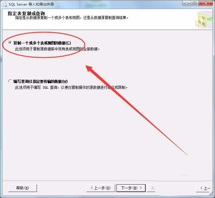 10、指定復(fù)制或查詢對話框中,選擇復(fù)制一個(gè)或多個(gè)表或視圖的數(shù)據(jù)選項(xiàng),單擊下一步。