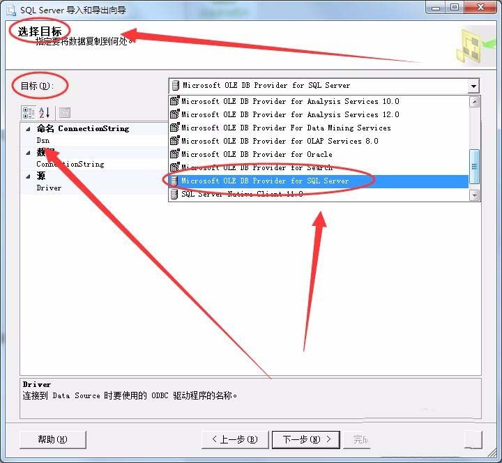 6、選擇目標(biāo)對話框中,選擇目標(biāo)選項(xiàng)中的Microsoft OLE DB Provider for SQL Server選項(xiàng)。