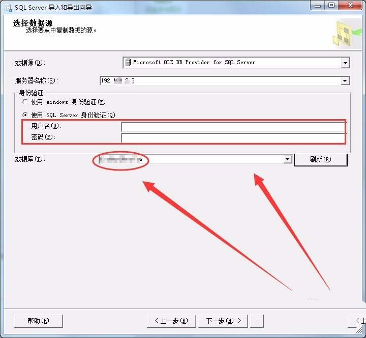 5、選擇使用SQL Server身份驗(yàn)證,輸入用戶名和密碼,選擇要導(dǎo)出的數(shù)據(jù)庫,單擊下一步。