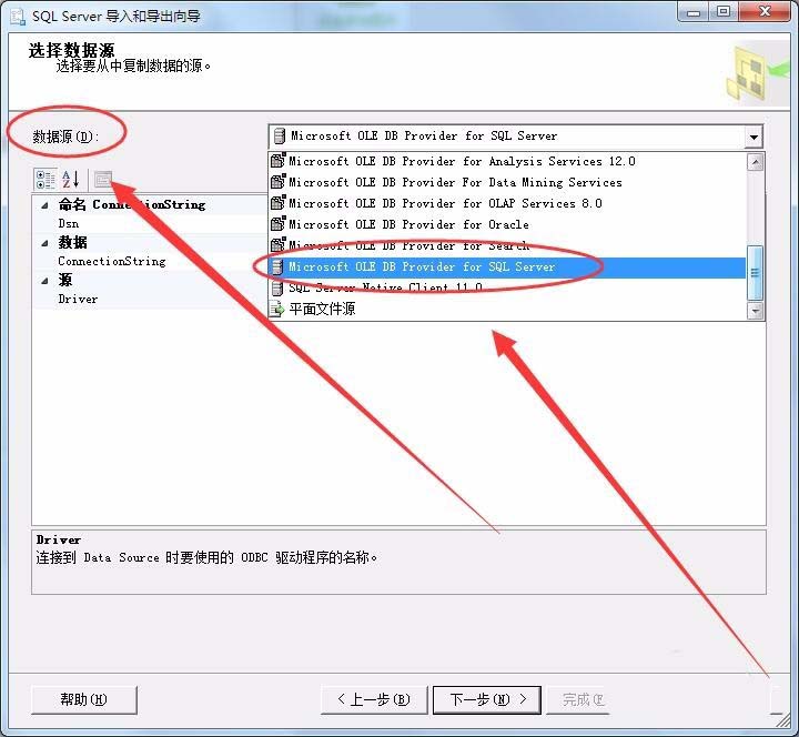 4、選擇數(shù)據(jù)源對話框中,選擇數(shù)據(jù)源選項(xiàng)中的Microsoft OLE DB Provider for SQL Server選項(xiàng)。