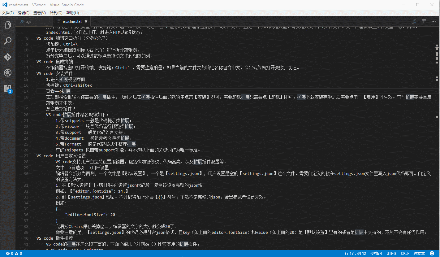 需要注意的是,【settings.json】的代碼必須符合json格式,且名稱(如上面的editor.fontSize)和值對(如上面的20)是【默認(rèn)設(shè)置】里有的或者是擴展中支持的,不然不會有任何作用。