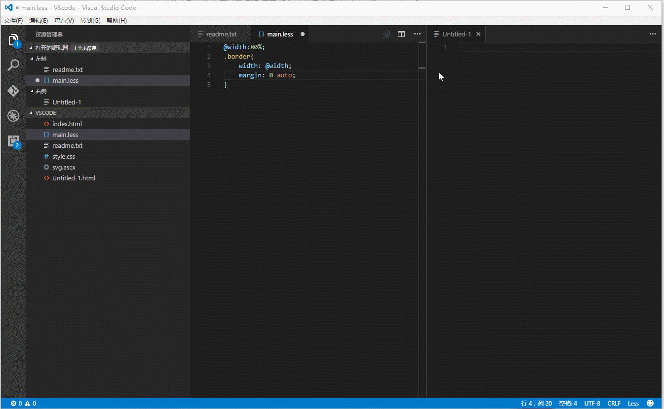 點擊拆分編輯器圖標(biāo)(右上角)進行拆分編輯器。拆分完畢之后,可以通過鼠標(biāo)點擊拖動文件到相應(yīng)的列。多列同時瀏覽免去多文件來回切換。