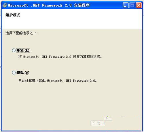 4、如果你已經(jīng)安裝過(guò)了,則會(huì)提示修復(fù)或卸載Microsoft.NET Framework2.0。