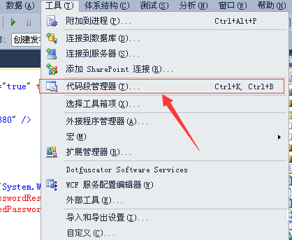 3、點(diǎn)擊工具菜單中之后,彈出了下拉菜單中選中為“代碼段管理器”即可。
