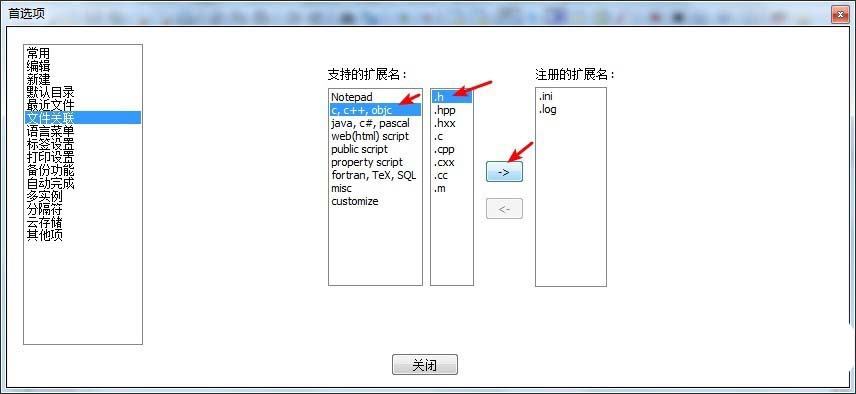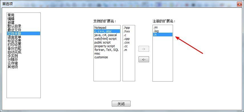 2、以.h文件為例,我們選擇,c c++ object這一項,級聯菜單多出來一列可選的文件格式,選擇.h,再點擊右向箭頭,然后就可以添加到支持的文件格式列表中了,然后關閉配置,就可以支持相應的格式了