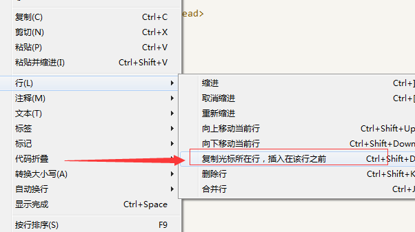 5、選中行之后,彈出了下一級菜單匯總,進行選中為“復制光標所在行,插入在該行之前”的選項。