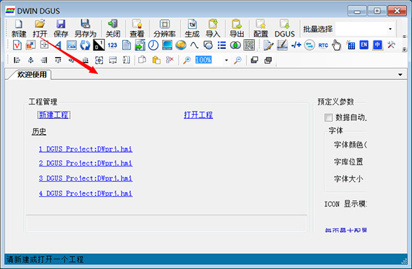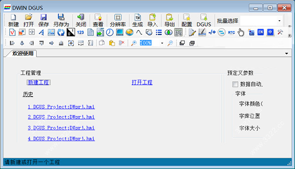 dwin dgus是由北京迪文科技有限公司推出的一款功能相當強大的DGUS屏開發配置軟件,該軟件為用戶提供了工程管理、字庫生成、圖片轉換、串口下載、ICO生成工具及字體設置等應用模塊,可以在一個頁面需要配置多個同類型按鈕及VP地址時,通過快速配置功能,將每個按鈕和對應的VP地址連接起來。通過這款軟件,可以對您需要的各種文件進行載入,也可對屬性自定義的完成設置,包括了對文件視頻地址的查看,使用方面也得到了相當不錯的加強,沒有多余的復雜操作步驟,也不需要進行鍵入您需要的代碼,幾步的即可完成需要的操作。接下來小編就給大家帶來DWIN DGUS使用方法,需要的朋友歡迎借鑒!