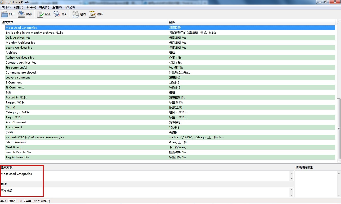 這個時候,我們要做的就是根據左側列出的源文本內容,逐行輸入翻譯后的結果。翻譯完畢后點擊菜單欄的【保存】按鈕,我們就成功制作出了可以漢化WordPress指定主題或插件的zh_CN.po和zh_CN.mo文件。將這兩個文件放入對應主題或插件的語言目錄,我們的主題或插件的漢化工作就完成了。