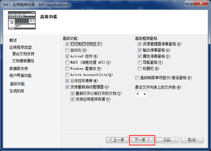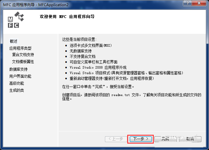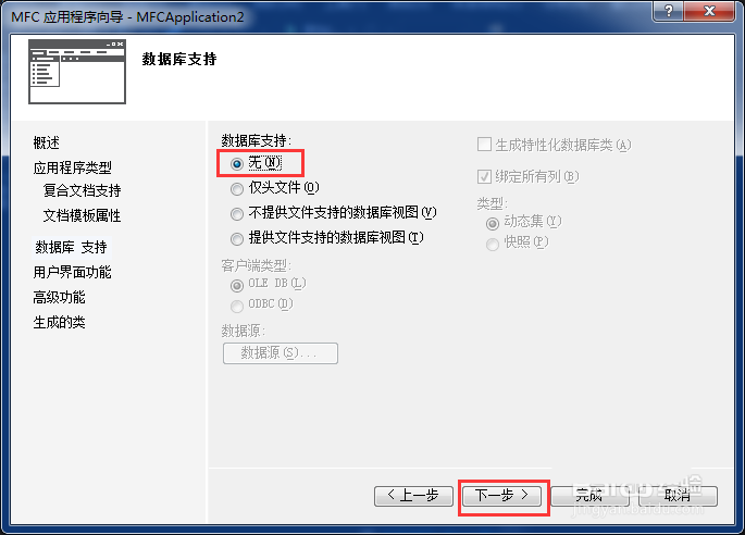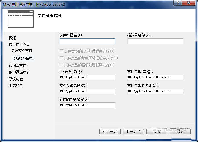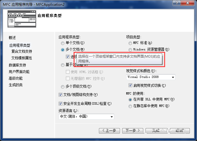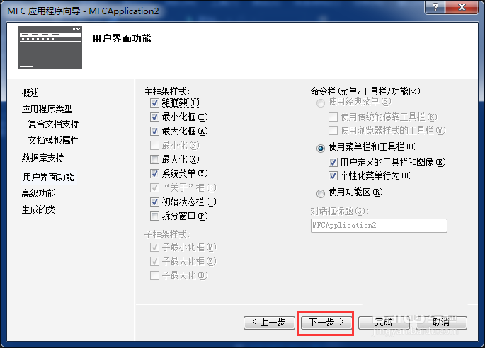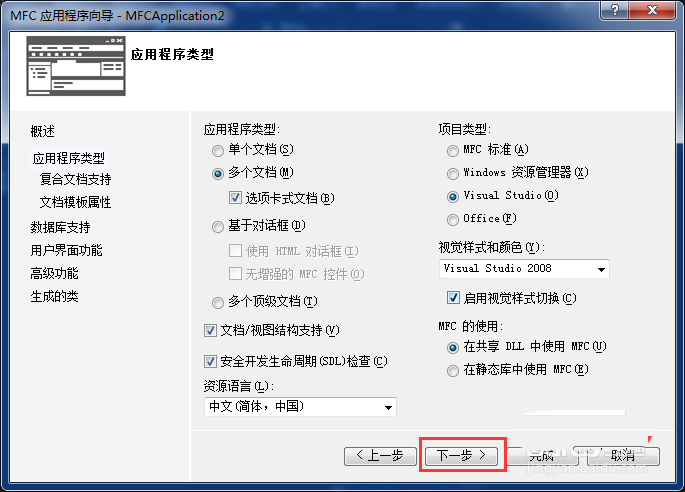5、這個界面一般主要就是選擇應用程序類型,多文檔的是最全的,設計相對也復雜點。對話框的話,結構有些功能是用不了的。之前就吃過虧,對話框的有些功能怎么也使用不了。