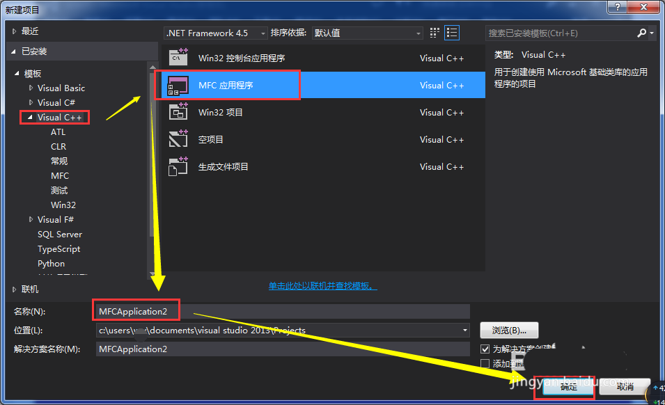 2、然后選擇MFC文件,如圖,輸入自己需要的工程名,然后確定,就可以進入向導界面。