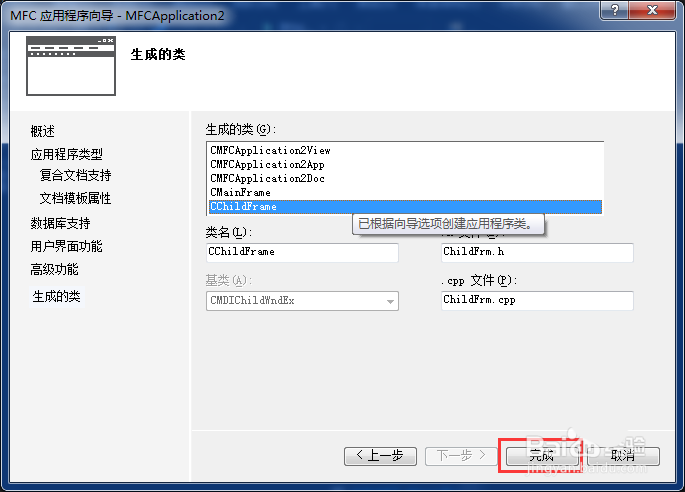 11、最后,系統就會根據配置,生成代碼,對應代碼的類結構如圖。點擊“完成”一個MFC的程序就完成了。