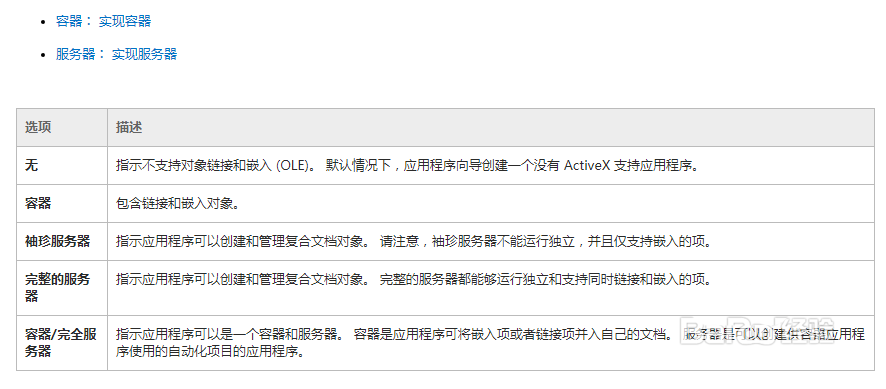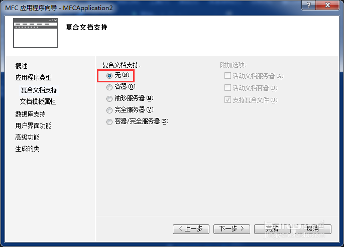 6、復合文檔。主要就是是否需要容器和服務器,一般程序不需要,選擇“無”,點擊下一步