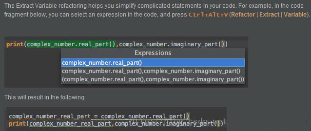 11.Extract Variable重構可以幫助您簡化代碼中的復雜語句。 例如,在下面的代碼片段中,可以在代碼中選擇一個表達式,然后按Ctrl + Alt + V。