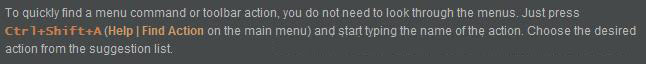 17.要快速查找菜單命令或工具欄操作, 只需按Ctrl + Shift + A(在主菜單上的幫助|查找操作)并開始輸入操作的名稱。 從建議列表中選擇所需的操作。